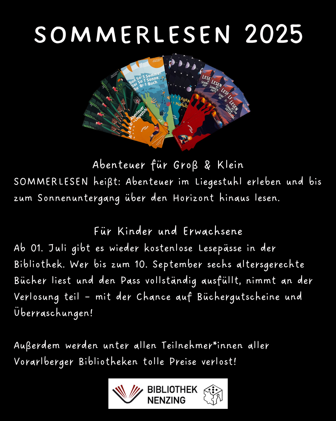 Bibliothek Nenzing, CW Aktuelles Hier finden Sie Aktuelles aus unserer Bücherei! Bücherflohmarkt Bibliothek Nenzing Sommerlesen Bibliothek Nenzing